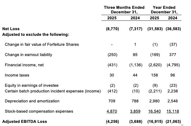 The following table provides a reconciliation of Net loss to Adjusted EBITDA, a non-GAAP measure. Adjusted EBITDA is defined as Net profit (loss) before financial expense (income), net, income taxes, equity in earnings of investee and depreciation and amortization, further adjusted to exclude share-based compensation and change in fair value of Forfeiture Shares and earnout liability, which may vary from period-to-period, and certain batch production incident expenses(income). We caution investors that amounts presented in accordance with our definition of Adjusted EBITDA may not be comparable to similar measures disclosed by other issuers, because not all issuers calculate Adjusted EBITDA in the same manner. Adjusted EBITDA should not be considered as an alternative to Net loss or any other performance measures derived in accordance with GAAP or as an alternative to cash flows from operating activities as a measure of our liquidity.